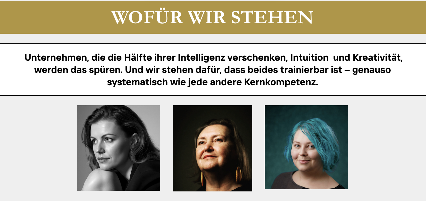 Wir trainieren die beiden Zukunftsskills, die in keiner KI-Strategie fehlen dürfen: Kreativität und Intuition. Nicht als Soft Skills am Rande – sondern als strategische Ressource im Zentrum. Damit endlich beide Gehirnhälften gleichberechtigt zum Einsatz kommen. Damit Ihr Unternehmen nicht nur auf Bekanntes reagiert, sondern Wege in die Zukunft findet – und die eigene Wasserstelle erreicht.